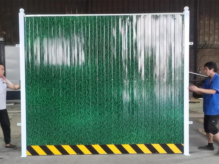 圍擋基腳采用M10水泥砂漿砌筑MU10頁巖磚磚砌0.5*0.5的基礎(chǔ),用于增強(qiáng)圍擋抗風(fēng)穩(wěn)定性;pvc圍擋設(shè)2.5米高,寬3米為一板。施工圍擋做美化處理,噴涂企業(yè)名稱、安全、質(zhì)量、文明施工用語及開發(fā)項目商業(yè)廣告,嚴(yán)禁張貼、涂寫垃圾廣告。